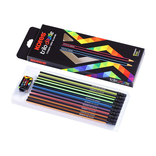 Kores Trilo Dazzle Pencils feature 5 vibrant neon stripes and a rubber tip for added versatility. With a triangular shape for ergonomic grip and dark lead for bold lines, they combine style, comfort, and functionality.