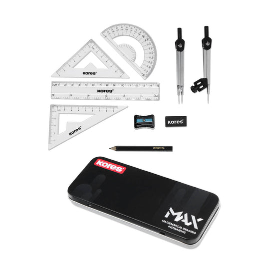 Discover the Kores Max Geometry Box, a top-quality, rust-free set designed for precision and durability. Its compact design fits perfectly in your bag, making it the best companion for math fun anywhere you go!