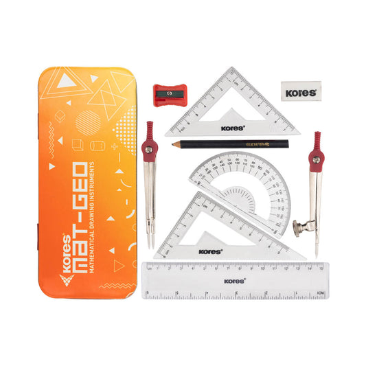 Introducing the Kores Mat Geo Geometry Box, a set of 9 durable, rust-resistant tools for precise drafting. With clear markings and vibrant color options—Orange, Blue, and Red—it's designed to enhance your mathematical accuracy and style.