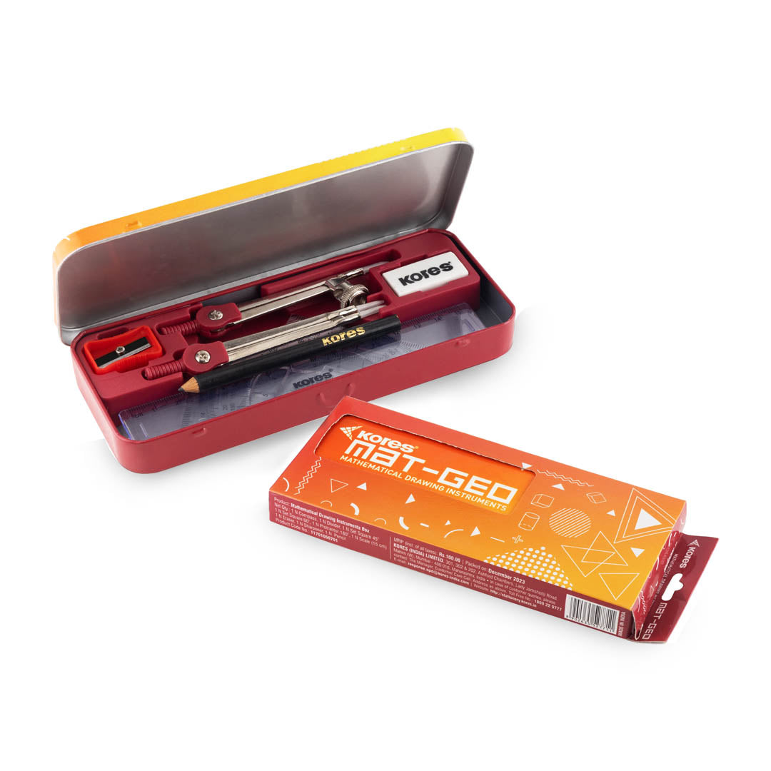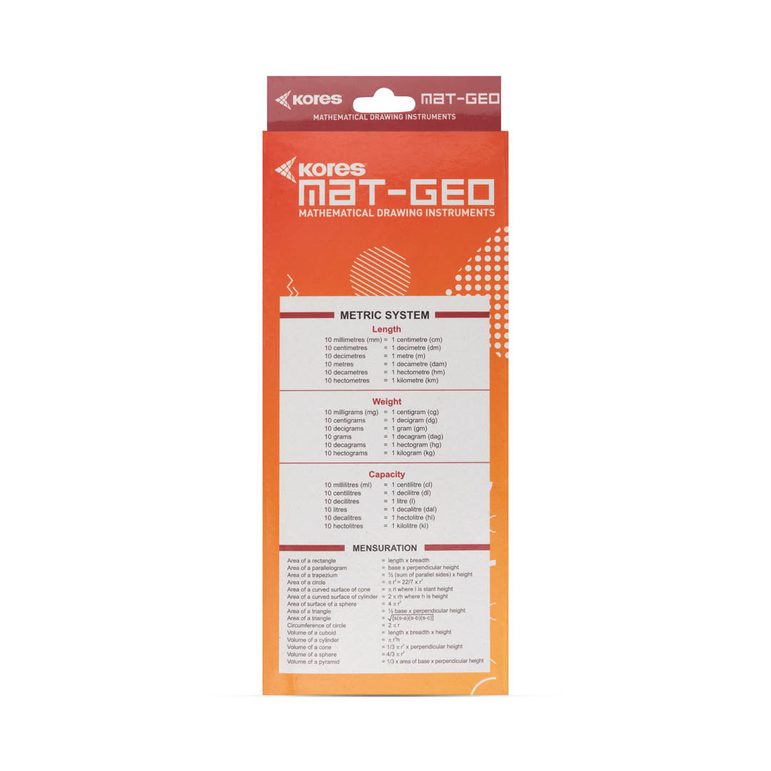 Introducing the Kores Mat Geo Geometry Box, a set of 9 durable, rust-resistant tools for precise drafting. With clear markings and vibrant color options—Orange, Blue, and Red—it's designed to enhance your mathematical accuracy and style.