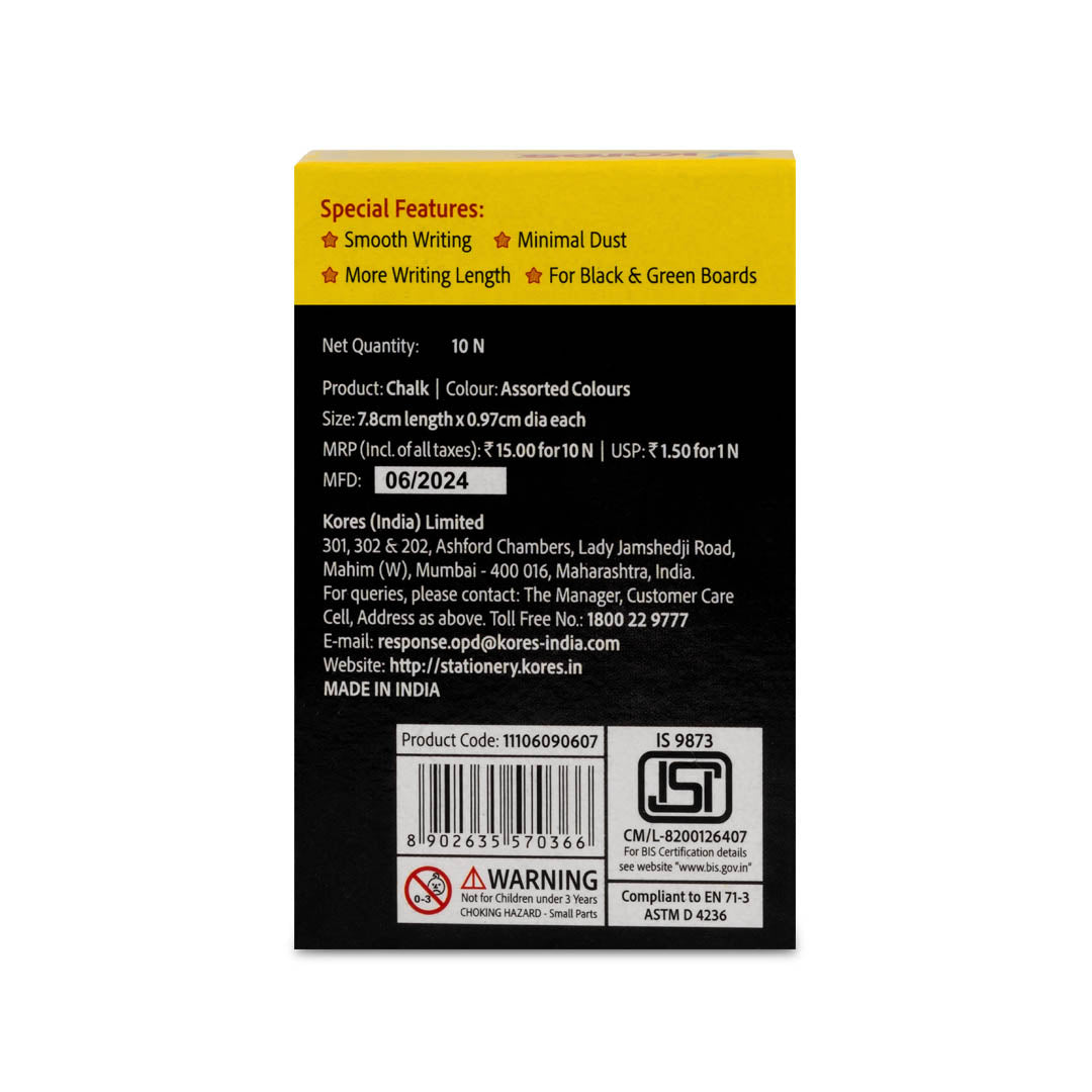 Add a splash of color to your classroom with Kores Coloured Chalk! Designed for smooth writing and minimal dust, these vibrant chalks keep your lessons bright and mess-free. Perfect for school use, they bring creativity to every board with easy, dust-free strokes that make learning fun and clean. Let the colorful fun begin!