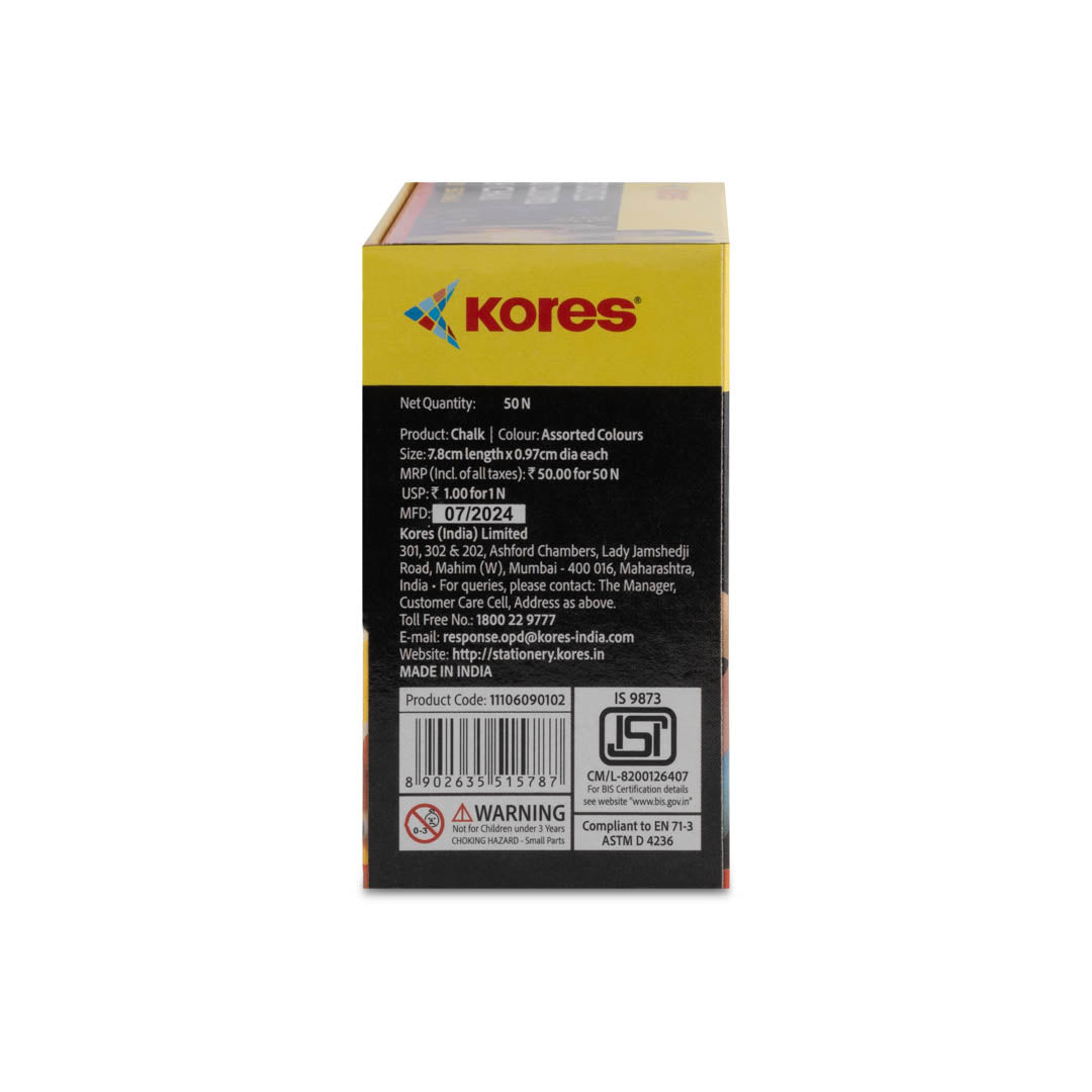 Add a splash of color to your classroom with Kores Coloured Chalk! Designed for smooth writing and minimal dust, these vibrant chalks keep your lessons bright and mess-free. Perfect for school use, they bring creativity to every board with easy, dust-free strokes that make learning fun and clean. Let the colorful fun begin!